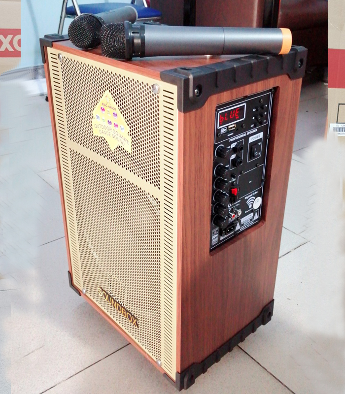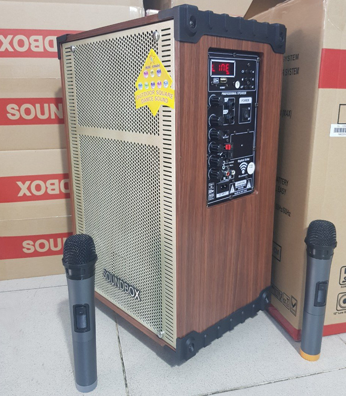 Loa kéo Soundbox SB-1209 được tích hợp bảng điều khiển ở bên hông của loa, nhìn vào trung tâm ta có thể thấy màn hình điện tử hiển thị chế độ phát nhạc và thời lượng sử dụng của pin, phía dưới là khe để cắm thẻ USB, thẻ SD giúp bạn dễ dàng nghe những bản nhạc mình thích một cách dễ dàng nhất, cùng các nút bấm tinh chỉnh bài hát lúc ở chế độ USB, phía bên trái là các hàng nút vặn dọc tinh chỉnh âm thanh cho loa và micro: bass, echo,...loa được tích hợp 2 cổng jack 6.5mm 1 cổng để cắm 1 micro có dây và 1 cổng nhạc cụ giúp cho cuộc vui thêm sôi động với loa kéo soundbox sb-1209