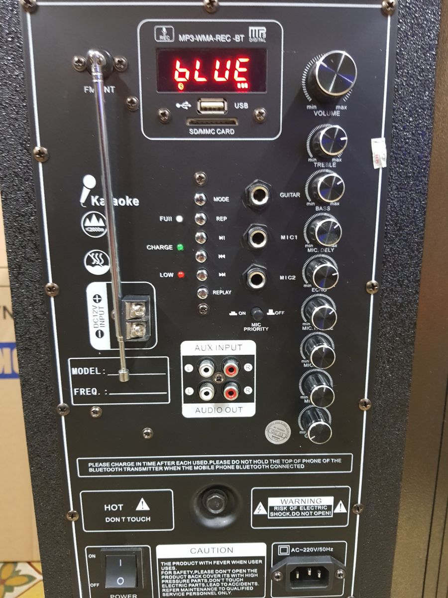 -Các cổng kết nối :Cổng USB/ SD Card / MMC, Bluetooth, cổng cắm nhạc cụ,Audio input( cổng nhận và phát âm thanh), Audio out (cổng xuất âm thanh, kết nối thêm loa Sub để tăng công suất), MIC1/ MIC2 (cổng cắm microphone 6.5mm)