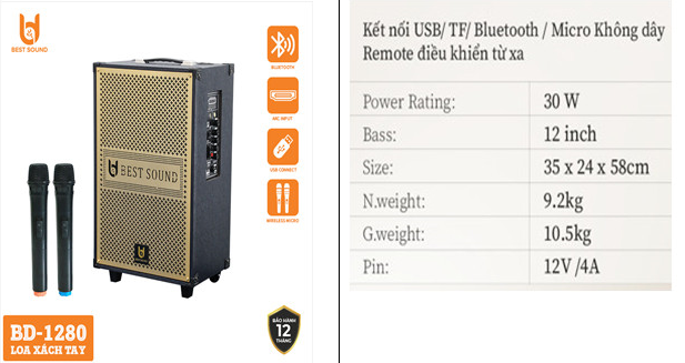 Loa Kéo Di Động Karaoke BD-1280 NEW (Bass 30cm, 2 Micro)